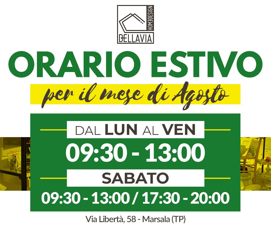 Leggi altro🕐 Orario #Estivo 🕐Bellavia Arredamenti a partire dall'1 #agosto fino al 3 #settembre effettuerà il seguente #orario #unico (dal lunedì al sabato) ⬇✅ Dalle 9:30 alle 13:00📍 Vieni nel nostro Showroom Bellavia Arredamenti Marsala in >> Vi...